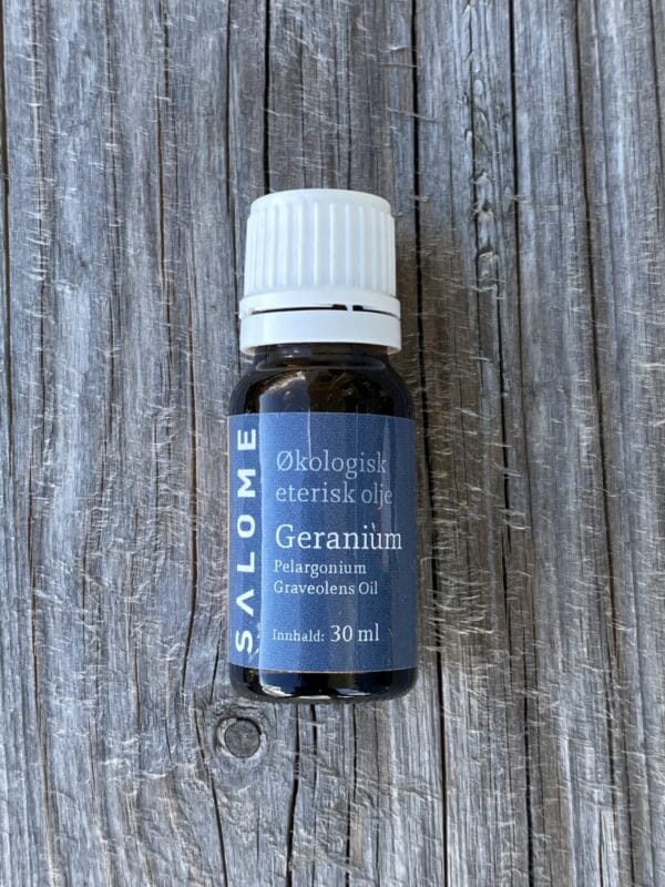 Fysisk støtte: Eterisk olje av geranium er ei oppkvikkande, reinsande og balanserande olje. Geranium verkar hormonbalanserande, sirkulasjons- og lymfestyrkjande, vassdrivande, antiseptisk og astringerande. Ei særs god olje til syklusrelaterte plager hos kvinner, klimakterieplager og væskeansamlingar. Ho verkar regenererande på huda og er god for ei rekkje hudproblem, som for eksempel tørr hud. Geranium verkar harmoniserande på kropp og sinn, og er fin ved stress og kjensle av utmatting.